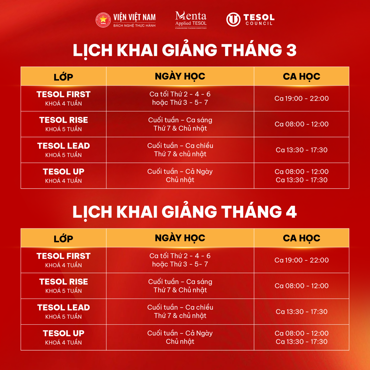 LỊCH KHAI GIẢNG TẠI MENTA TESOL